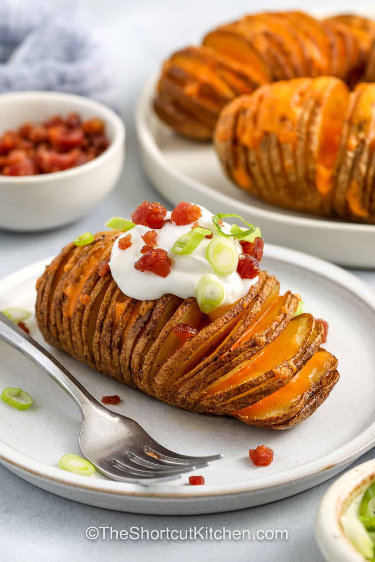 This Hasselback potatoes recipe makes a show-stopping side dish. Thin slices of potato are roasted until tender and fluffy, then loaded with cheese, bacon, and sour cream for an impressive holiday-worthy dish.